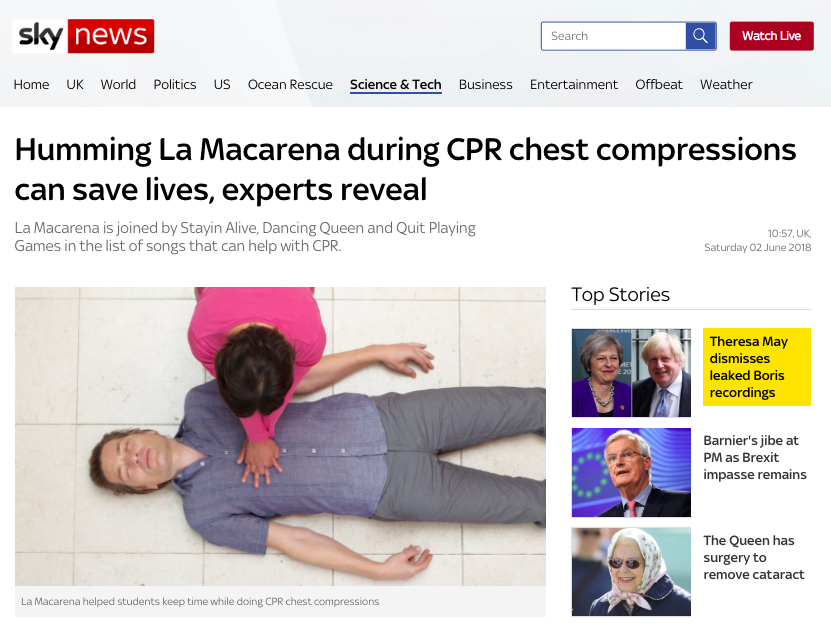 So apparently catchy mid-paced pop classics are not only hits at the office Christmas party, they can also save lives. This is the article Steve has been talking about on his weekend evening show that shows how singing the Macarena whilst helping a victim of cardiac arrest might help people give CPR more effectively.